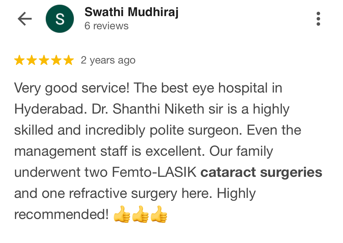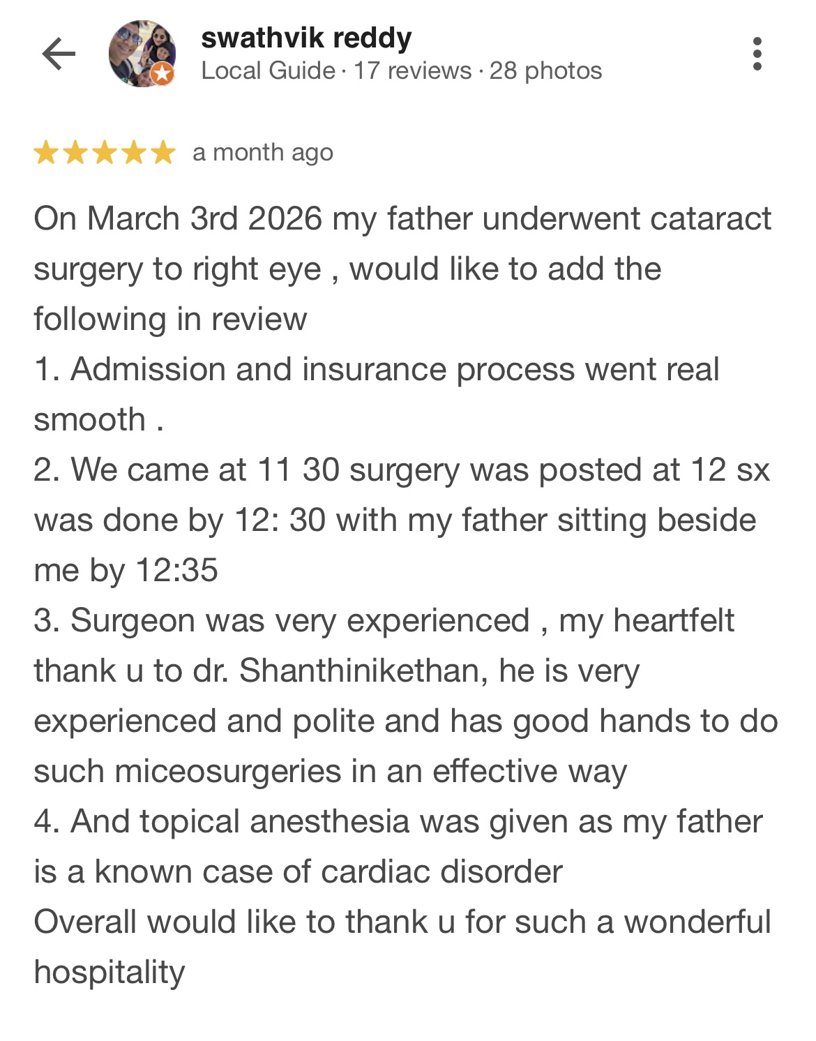 Shanthi Nethralaya Eye Hospital is widely recognized as the best eye hospital in Hyderabad, committed to delivering quality, compassionate, and accessible eye care. Led by Dr. B. Shanthi Niketh, one of Hyderabad top eye specialists, our hospital provides a comprehensive range of services, from routine eye check-ups to advanced eye surgeries. Discover why patients choose Shanthi Nethralaya as their preferred eye hospital in Hyderabad, where affordability meets top-notch care every day.