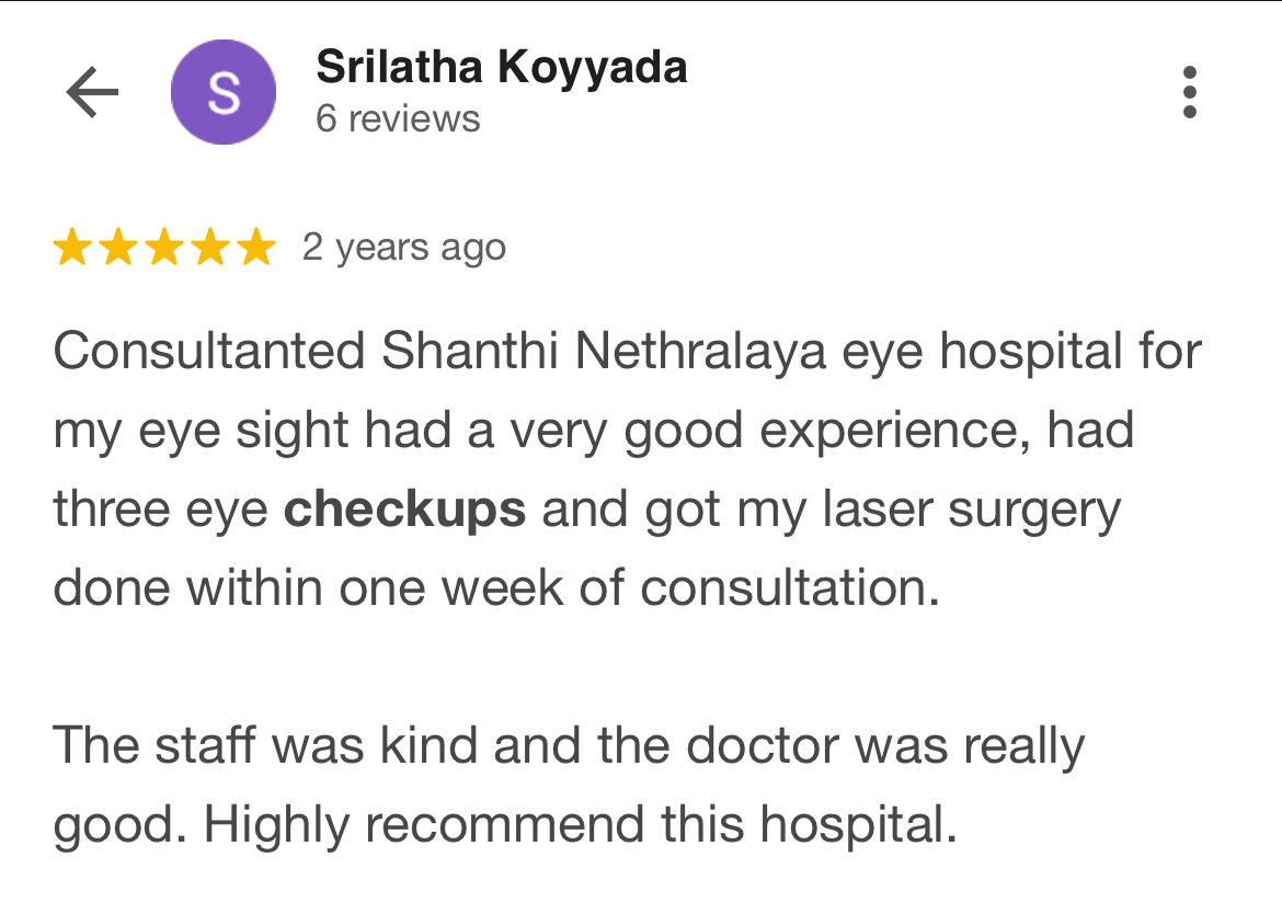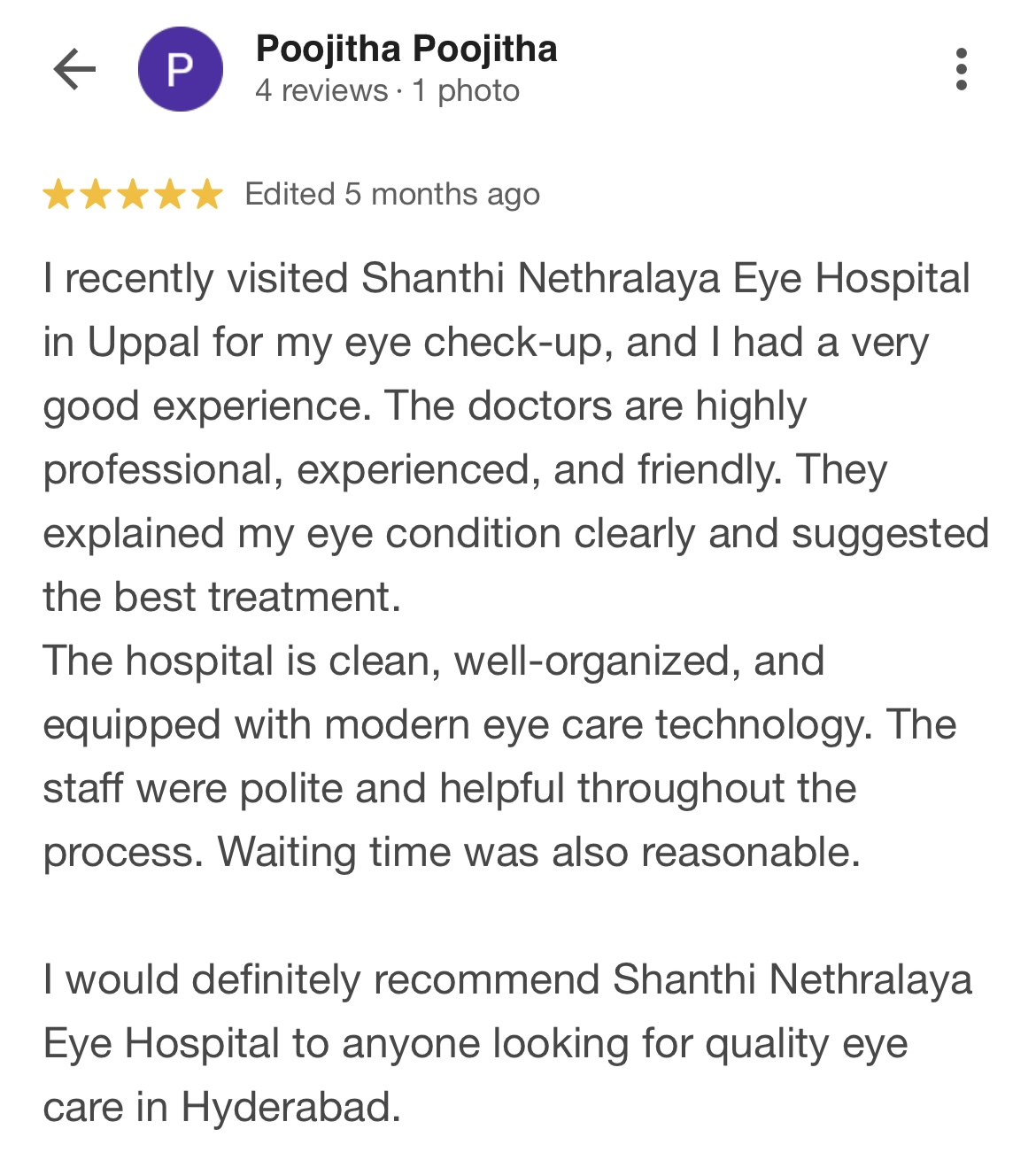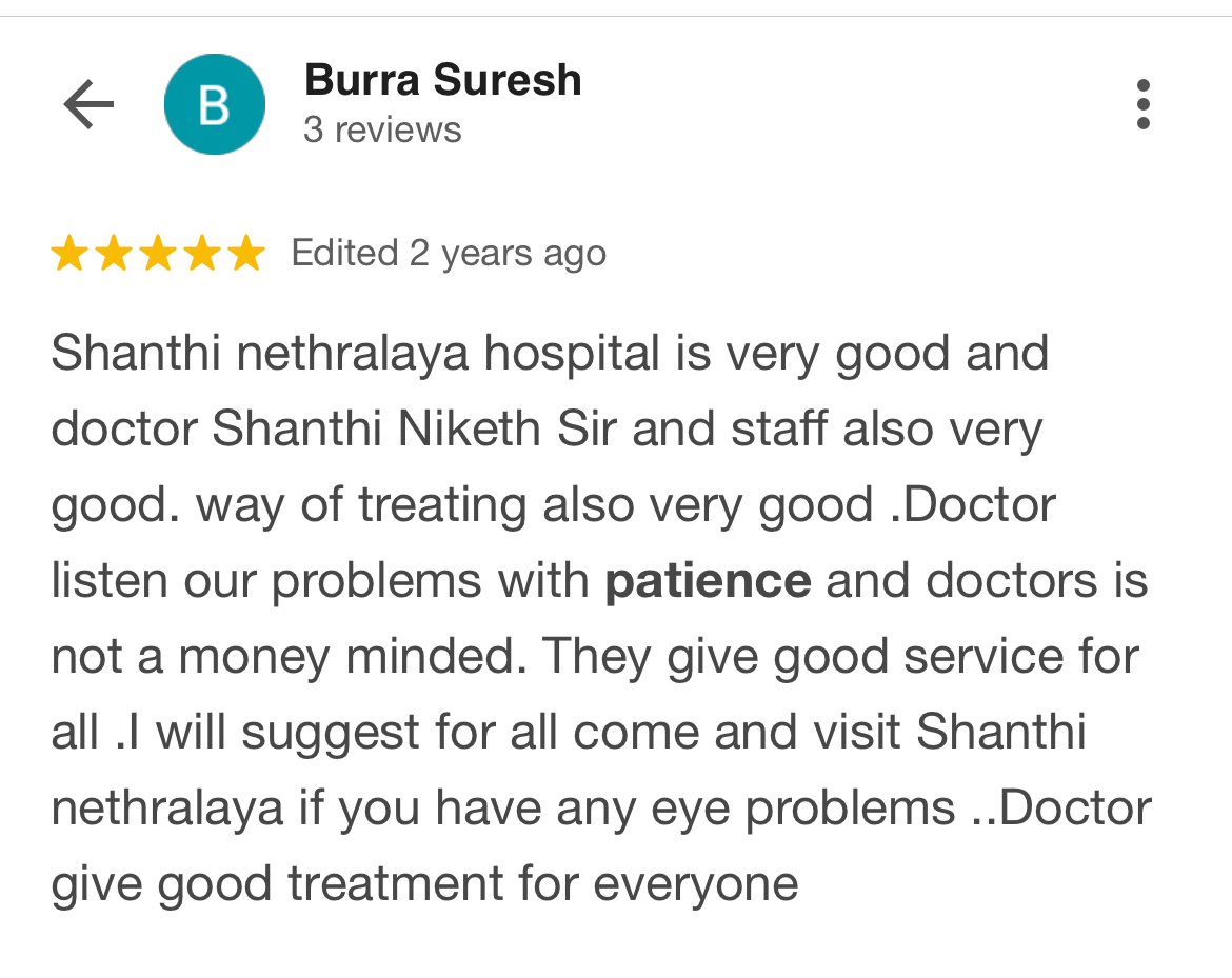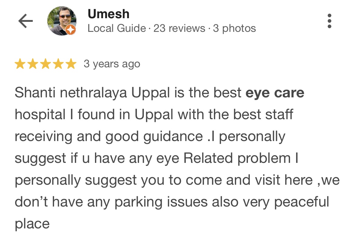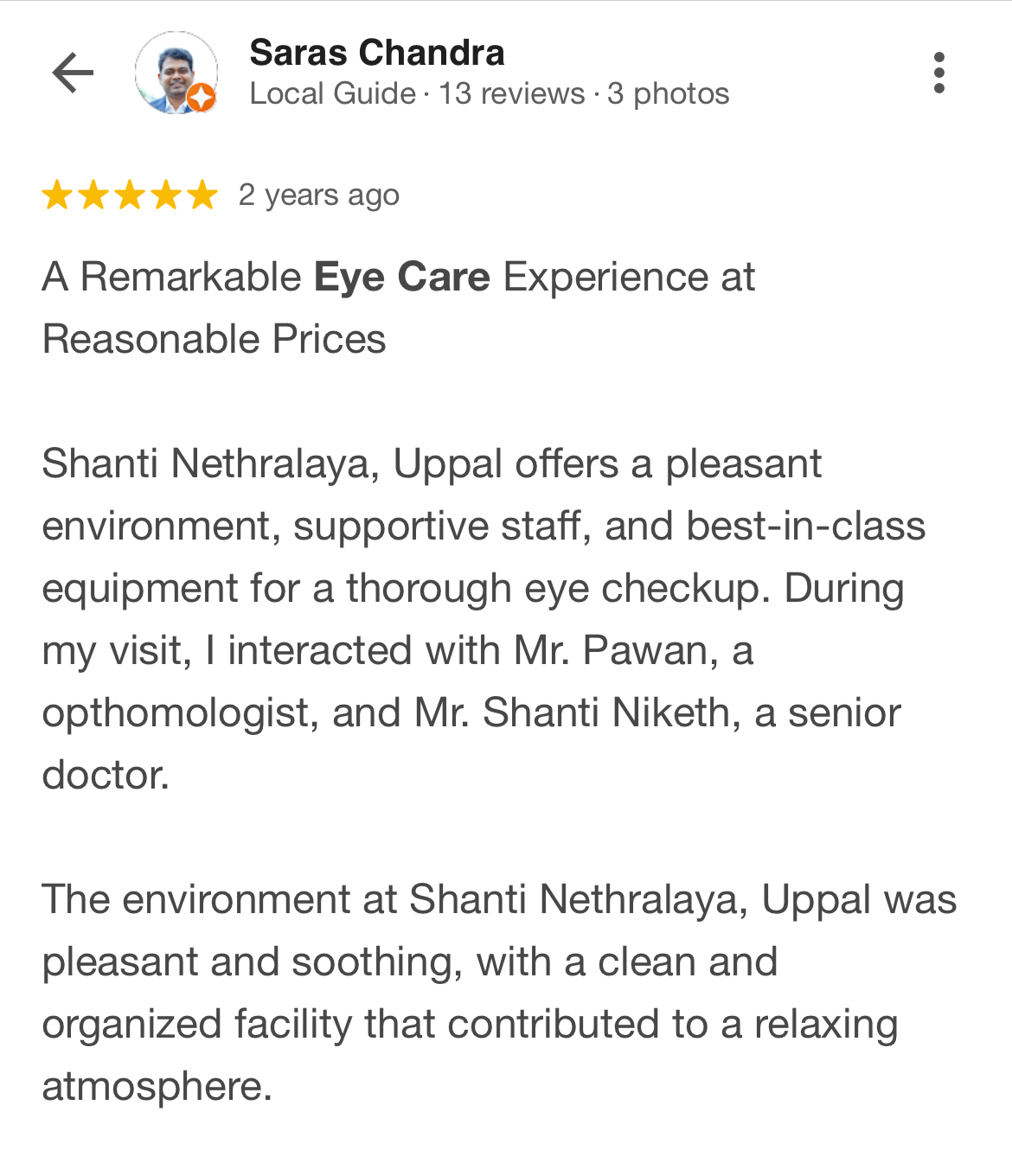 1)While traveling on NH163, also known as Hyderabad Warangal Highway, towards Warangal. 2)After about 1.2 km from Uppal ‘x’ road, make a U-turn just before the Asian Multiplex Theatre. 3)Take a left turn near Darbar Bar and Restaurant. You’ll also notice it nearby. 4)After taking the left turn at Darbar Bar and Restaurant, proceed ahead and take the first right. 5)You will then see Shanthi Nethralaya Eye Hospital on the left-hand side. These simplified directions will guide you to Shanthi Nethralaya Eye Hospital effectively. 2)In the search bar, type “Shanthi Nethralaya Eye Hospital” and press Enter or tap on the search icon. 3)Google Maps will display the location of Shanthi Nethralaya Eye Hospital on the map, along with additional information such as address, contact details, and reviews. 4)If you’re using the Google Maps app on your smartphone, you can tap the “Directions” button to get directions to the hospital from your current location.