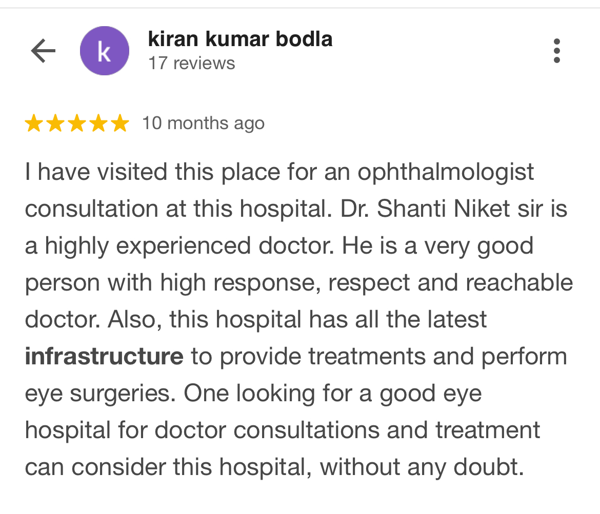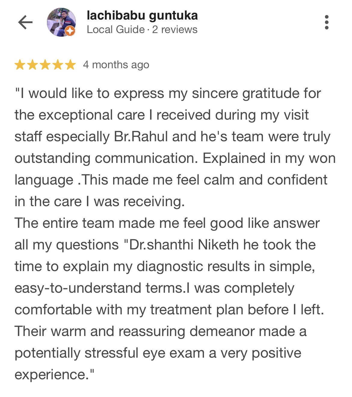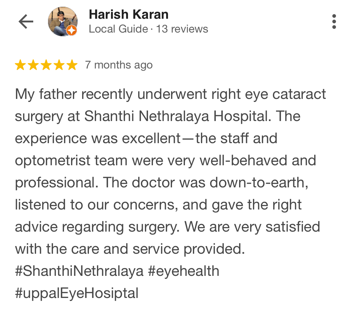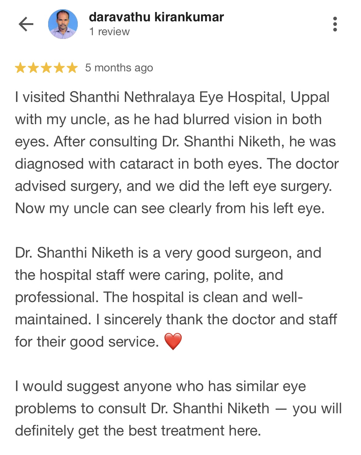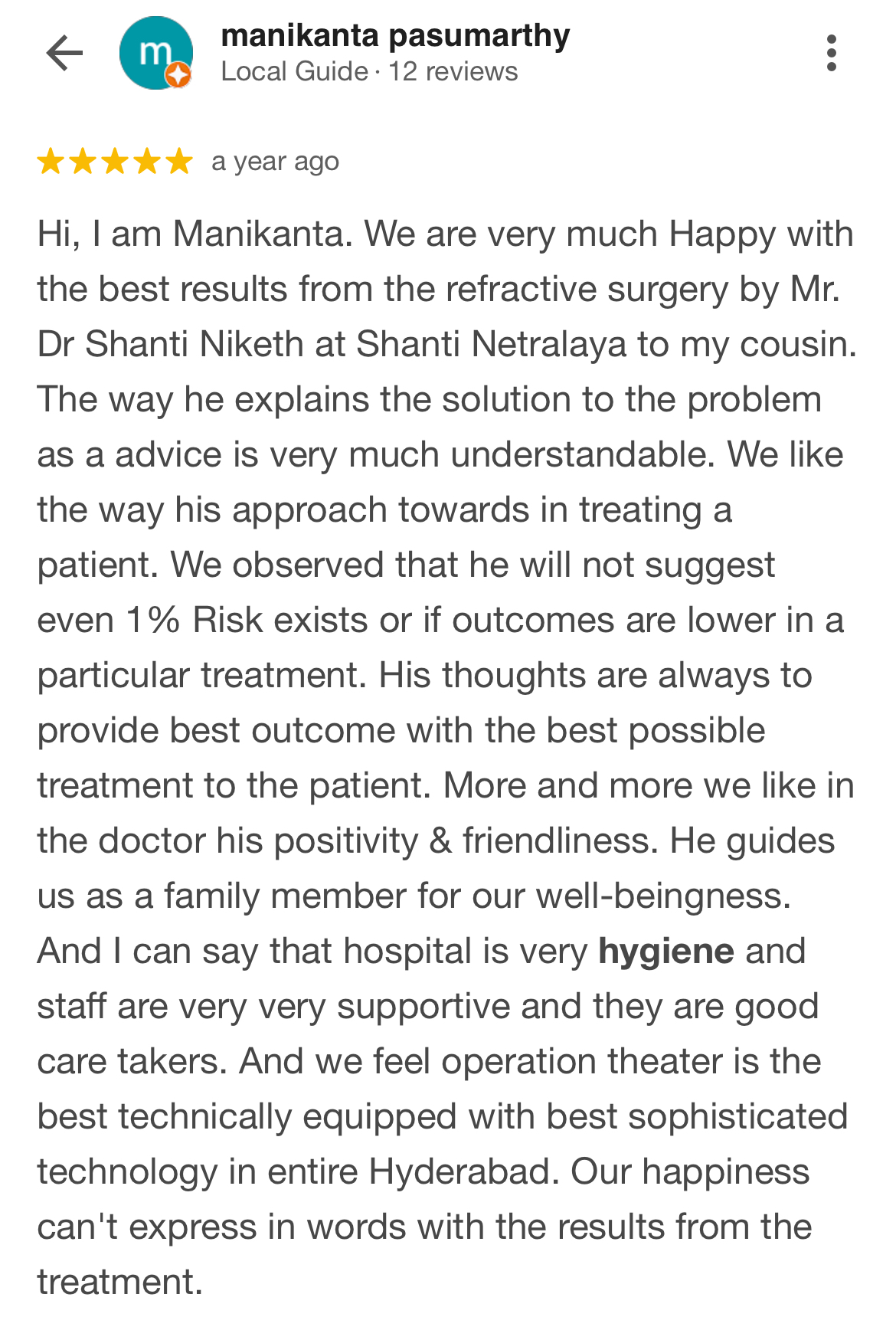 1)While traveling on NH163, also known as Hyderabad Warangal Highway, towards Warangal. 2)After about 1.2 km from Uppal ‘x’ road, make a U-turn just before the Asian Multiplex Theatre. 3)Take a left turn near Darbar Bar and Restaurant. You’ll also notice it nearby. 4)After taking the left turn at Darbar Bar and Restaurant, proceed ahead and take the first right. 5)You will then see Shanthi Nethralaya Eye Hospital on the left-hand side. These simplified directions will guide you to Shanthi Nethralaya Eye Hospital effectively. 2)In the search bar, type “Shanthi Nethralaya Eye Hospital” and press Enter or tap on the search icon. 3)Google Maps will display the location of Shanthi Nethralaya Eye Hospital on the map, along with additional information such as address, contact details, and reviews. 4)If you’re using the Google Maps app on your smartphone, you can tap the “Directions” button to get directions to the hospital from your current location.